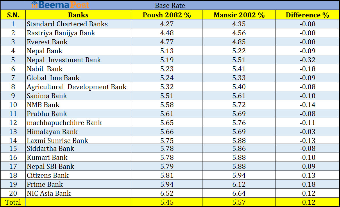 यस्तै, राष्ट्रिय वाणिज्य बैंकको आधार दर पनि ४.४८ प्रतिशत, एभरेष्ट बैंकको ४.७७ प्रतिशत, नेपाल बैंकको ५.१३ प्रतिशत, नेपाल इन्भेष्टमेन्ट मेगा बैंकको ५.१९ प्रतिशत, नबिल बैंकको ५.२३ प्रतिशत र ग्लोबल आइएमई बैंकको ५.२४ प्रतिशत रहेको छ ।