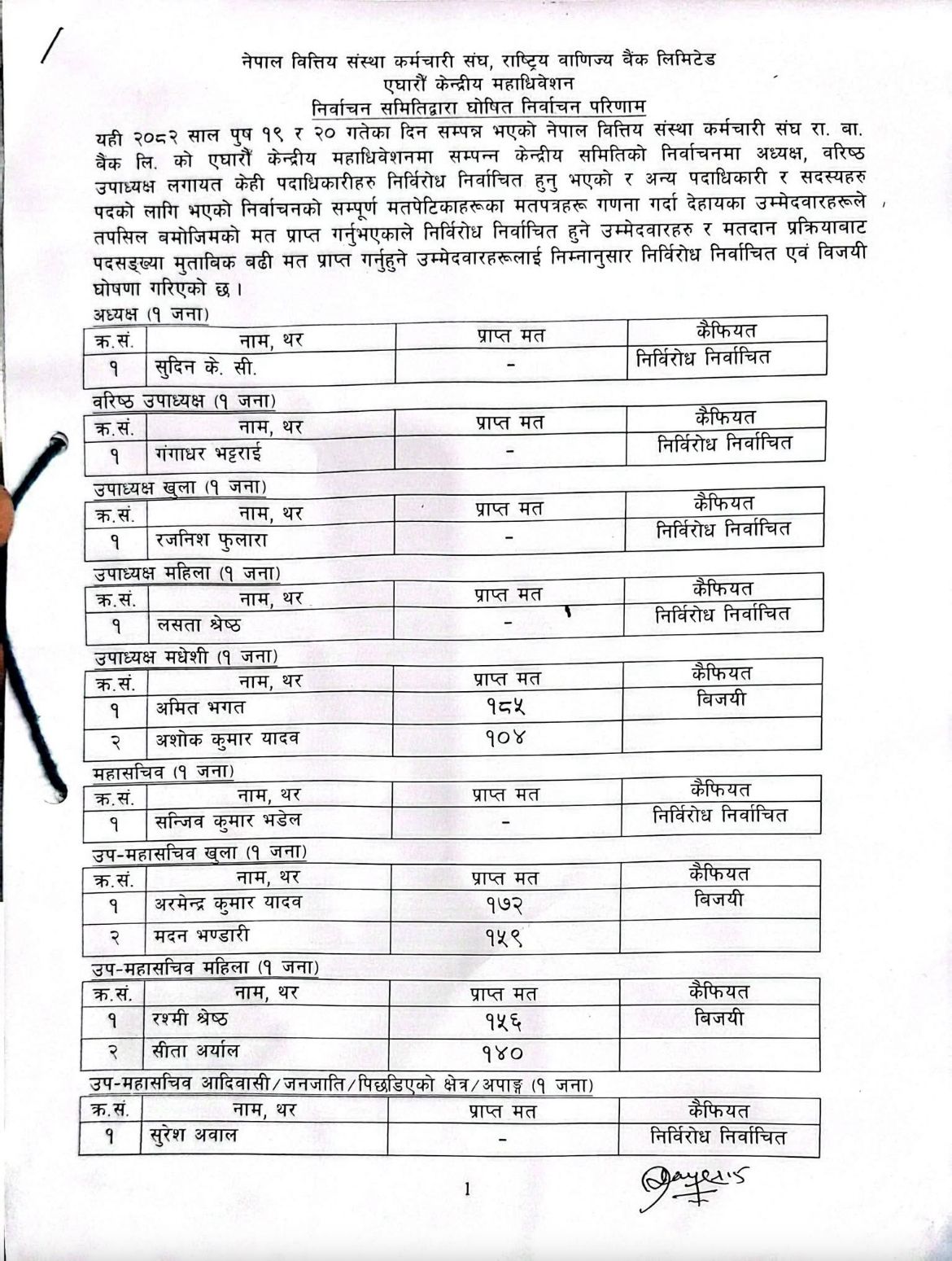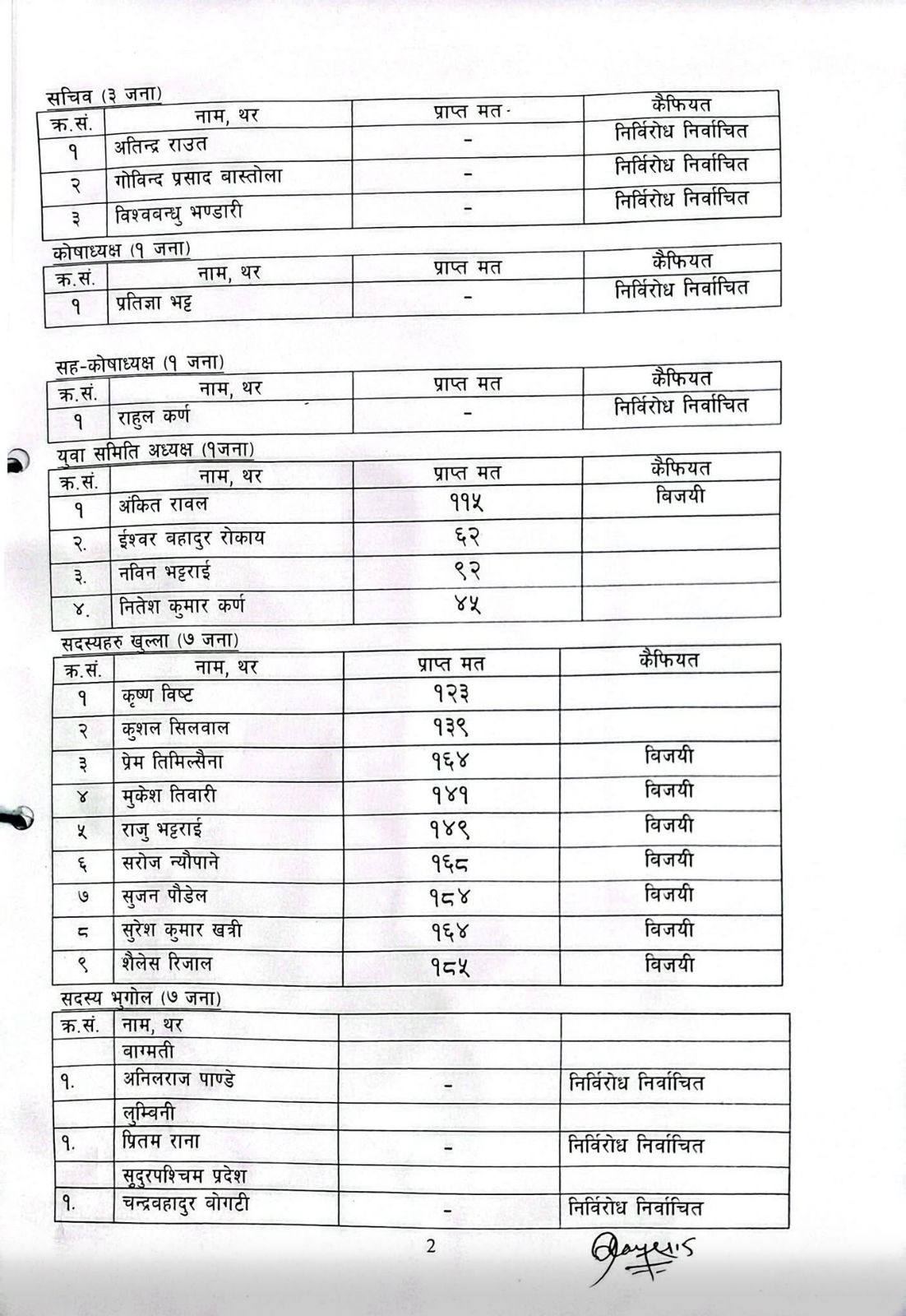 महासचिव पदमा सन्जिव कुमार भडेल निर्विरोध निर्वाचित भएका छन्। उपमहासचिव खुला तर्फ मदन भण्डारीलाई हराउँदै अरमेन्द्र कुमार यादव निर्वाचित भएका छन् भने उपमहासचिव महिला तर्फ रश्मी श्रेष्ठ र उपमहासचिव आदिवासी जनजाति तर्फ सुरेश अवाल निर्वाचित भएका छन्।