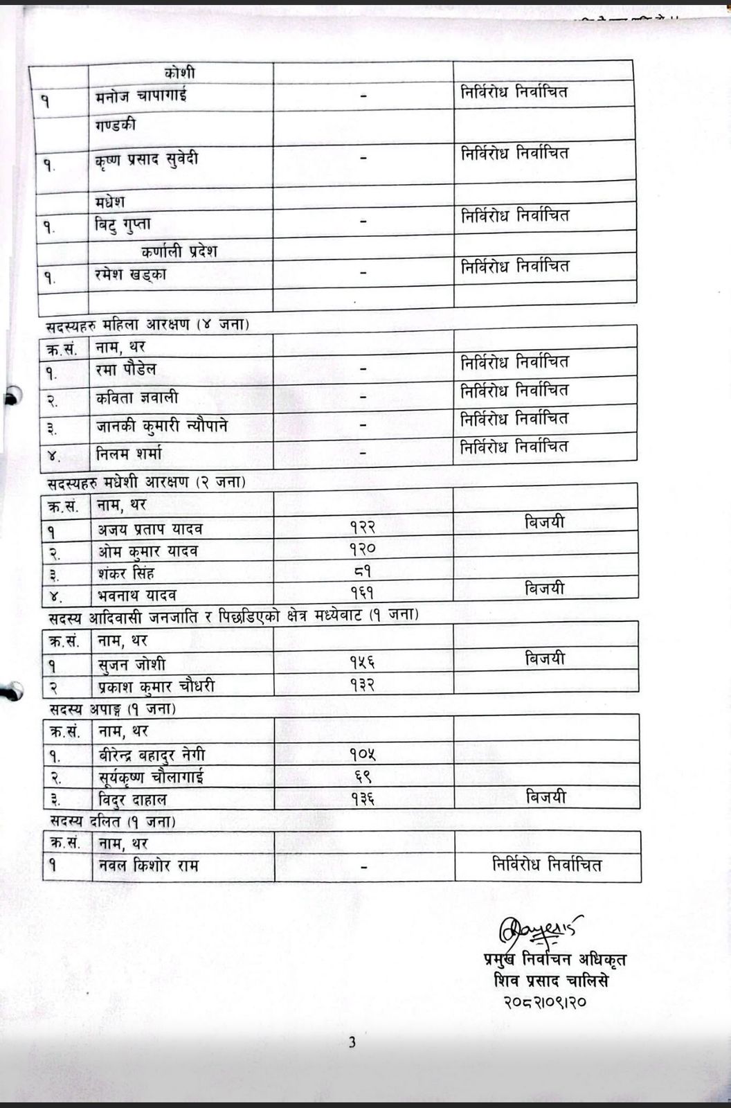 त्यसैगरी केन्द्रीय सदस्यमा खुला तर्फ ७ जना, भुगोल तर्फ ७ जना, महिला तर्फ ४ जना, मधेशी तर्फ २ जना, आदिवासी जनजाति तर्फ १ जना, अपाङ्ग तर्फ १ जना र दलित तर्फ १ जना निर्वाचित भएका छन्।
