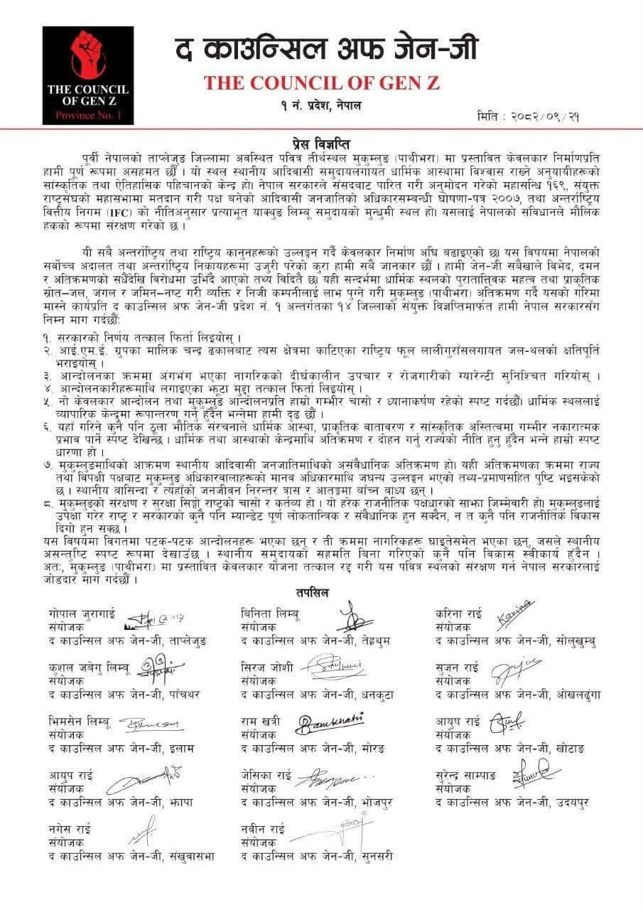 उनीहरुले संयुक्त रुपमा लिखित वक्तव्य नै जारी गरेर पूर्वी नेपालको ताप्लेजुङ जिल्लामा अवस्थित पवित्र तीर्थस्थल मुक्कुम्लुङ (पाथीभरा)मा भइरहेको केबुलकार निर्माणप्रति पूर्णरुपमा असहमत रहेको जाहेर गरेका छन् । मुक्कुम्लुङ अर्थात् पाथीभरालाई उनीहरुले आदिवासी समुदायसहित किराँत र हिन्दु सभ्यताका अनुयायीको सांस्कृतिक तथा ऐतिहासिक पहिचानको केन्द्र भएको र राज्यले स्वीकारेका अन्तर्राष्ट्रिय सन्धि तथा संविधानको मौलिक हक समेत छिन्न खोजिएको आरोप उनीहरुले लगाएका छन् । जेनजी अभियन्ताहरुले केबुलकार निर्माणको अनुमति, जग्गा प्राप्ति तथा खरिदविक्रि र वन, वातावरण, धर्म, सभ्यतामाथि गरिएको छेड्खानीको सत्यतथ्य छानविनको माग गरेका छन् । आफुहरुले माग गरे अनुसार तत्काल छानविनको प्रक्रियाअघि नबढाइए आफुहरुले थप कडा कदम चाल्ने चेतावनी जेनजी अभियन्ताहरुले दिएका छन् ।