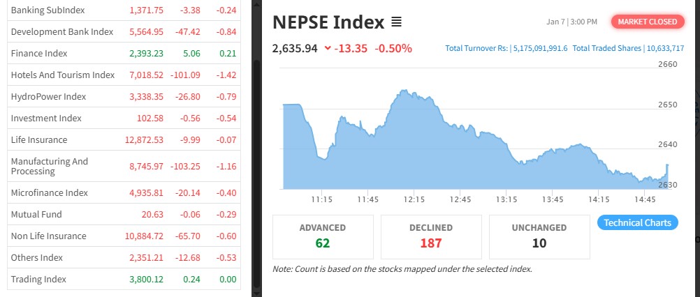 नेपाल स्टक एक्सचेञ्ज (नेप्से) १३.३५ अकंले घटेर २६३५.९४ बिन्दुमा कायम भएको छ । आज ३२३ कम्पनीको १ करोड ६ लाख ३३ हजार कित्ता शेयर किनबेच हुँदा ५ अर्ब १७ करोड ५० लाख ९१ हजार रुपैयाँको कारोबार भएको हो ।