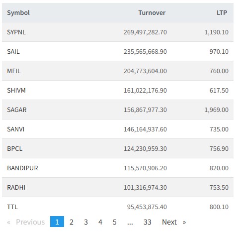 त्यस्तै, श्रीनगर, मञ्जुश्री फाइनान्स, शिवम सिमेन्टस, सागर डिष्टिलरी, सान्भी इनर्जी, वुटवल पावर, बन्दीपुर, राद्यी विद्युत् र टेड्र टावरको सर्वाधिक कारोबार भएको छ ।