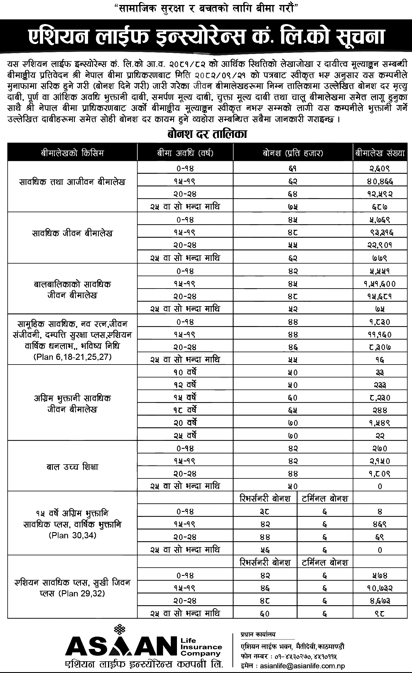 यता बालबालिकाको सावधिक जीवन बीमालेखमा ४२ रुपैयाँदेखि ५२ रुपैयाँसम्म तथा सामूहिक सावधिक, नव रत्न, जीवन संजीवनी, दम्पत्ति सुरक्षा प्लस, एशियन वार्षिक धनलाभ र भविष्य निधिमा ४४ रुपैयाँदेखि ५५ रुपैयाँसम्म बोनसदर कायम भएको छ।