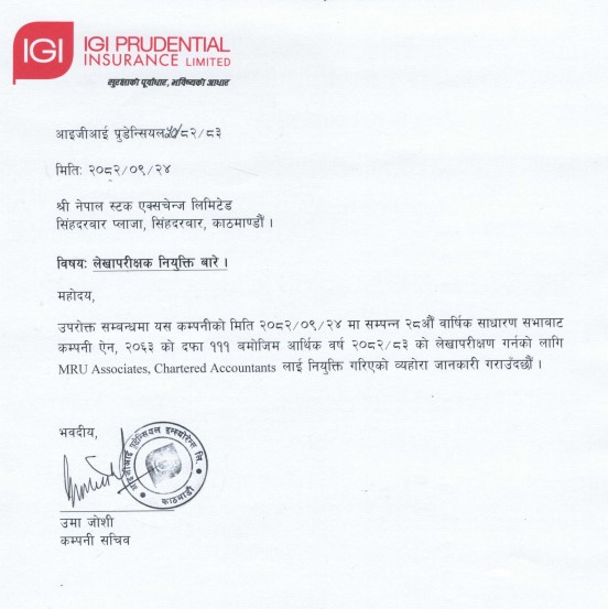 काठमाडौं । आइजिआई प्रुडेन्सियल इन्स्योरेन्स लिमिटेडले चालु आर्थिक वर्षको लेखापरिक्षण गराउँनको लागि लेखापरिक्षक नियुक्त गरेको छ ।