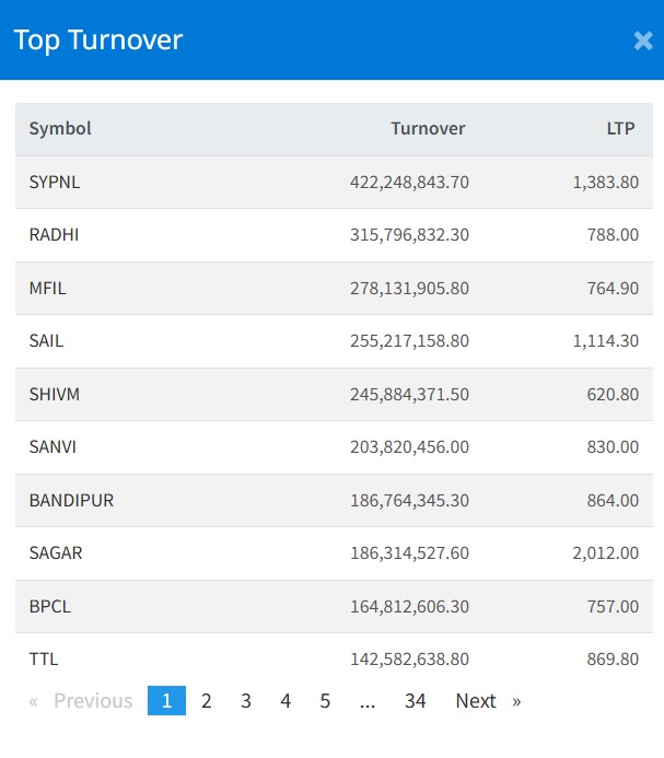 शेयर बजारमा सोमबार एसवाई प्यानलको सबैभन्दा बढी कारोबार भएको छ । कम्पनीको आज ४२ करोड २२ लाख रुपैयाँको शेयर खरिद–बिक्री भएको छ । साथै, राधी विद्युत कम्पनीको ३१ करोड ५७ लाख रुपैयाँ, मन्जु श्री फाइनान्सको २७ करोड ८१ लाख रुपैयाँ, श्रीनगर एग्रोटेकको २५ करोड ५२ लाख रुपैयाँ र शिवम् सिमेन्टको २४ करोड ५८ लाख रुपैयाँले सर्वाधिक कारोबार भएको छ ।