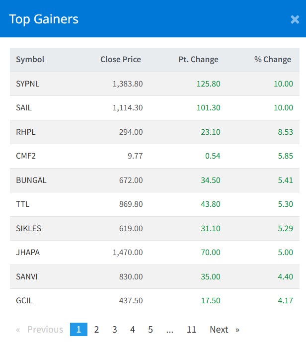 शेयर बजारमा आज विभिन्न सेक्टरका ७५ वटा कम्पनीहरुको शेयरमूल्यमा हरियाली छाएको छ । जसमा आज एसवाई प्यानल र श्रीनगर एग्रोटेकको शेयरमूल्यमा सकारात्मक सर्किट लागेको छ ।