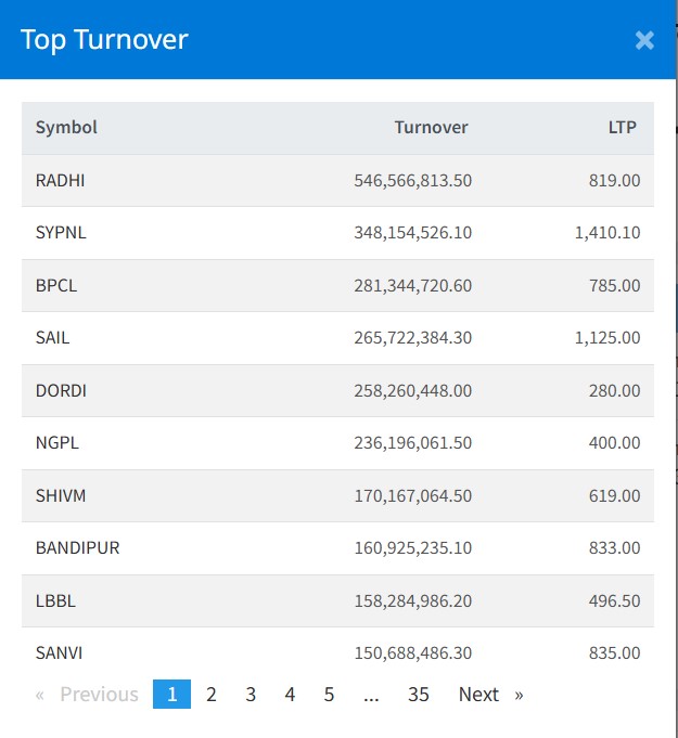 शेयर बजार बढेसँगै आज विभिन्न सेक्टरका कम्पनीहरुको ६ अर्ब ९९ करोड चार लाख रुपैयाँ शेयर कारोबार भएको छ । जसमा आज राधि जलविद्युतको ५४ करोड ६५ लाख रुपैयाँ, एसवाई प्यानलको ३४ करोड ८१ लाख रुपैयाँ, बुटवल पावर कम्पनीको २८ करोड १३ लाख रुपैयाँले सर्वाधिक कारोबार भएको छ ।