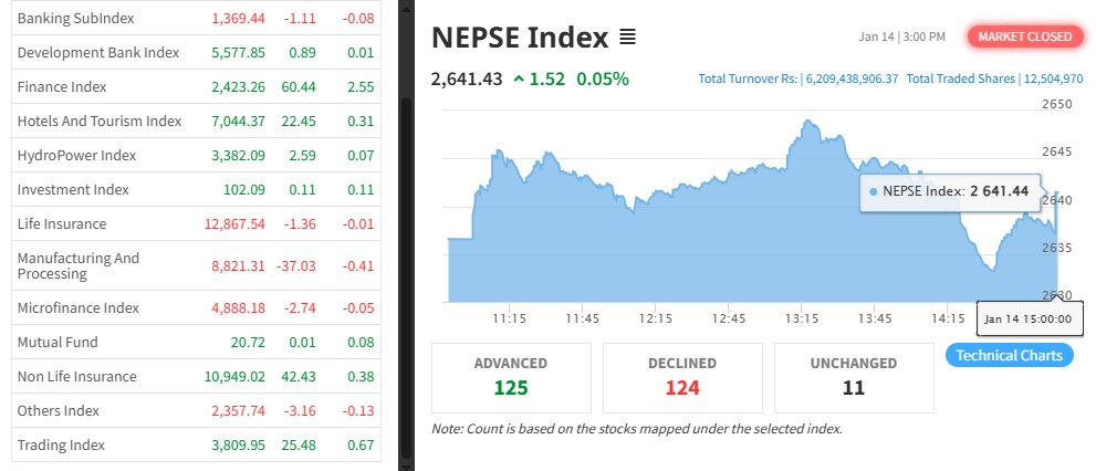 नेपाल स्टक एक्सचेञ्ज (नेप्से) १.५२ अकंले बढेर २६४१.४३ बिन्दुमा कायम भएको छ । आज ३२० कम्पनीको १ करोड २५ लाख ४ हजार कित्ता शेयर किनबेच हुँदा ६ अर्ब २० करोड ९४ लाख रुपैयाँको शेयर कारोबार भएको हो ।