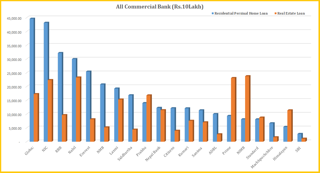 साथै, नबिल बैकको रियल इस्टेट कर्जा ३.१४ प्रतिशतले घटेर २३ अर्ब ३० करोड, प्राइमको १४.३८ प्रतिशतले बढेर २३ अर्ब १० करोड, एनआईसी एशिया बैंकको १६.३० प्रतिशतले घटेर २२ अर्ब ३६ करोड रुपैयाँ रहेको छ ।