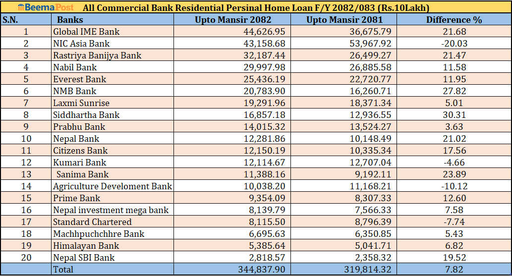 यसअवधिमा सर्वाधिक आवासीय कर्जा प्रभाव गर्नेमा ग्लोबल आईएमई बैंक पहिलो नम्बरमा रहेको छ । मंसिर मसान्तसम्म आइपुग्दा बैंकले ४४ अर्ब ६२ करोड ६९ लाख रुपैयाँ कर्जा दिएको छ । जुन गत आर्थिक वर्षको सोहि अवधिको तुलनामा २१.६८ प्रतिशतले बढी हो ।