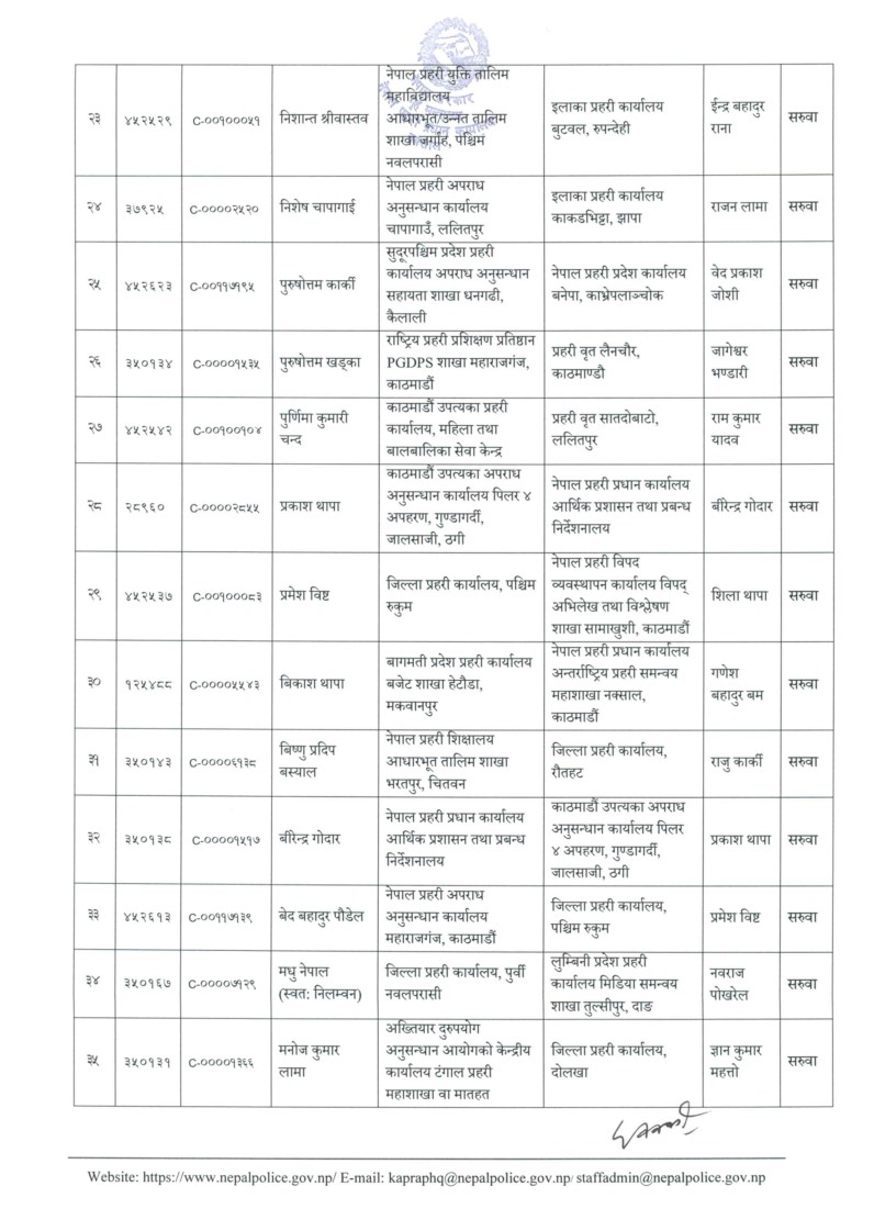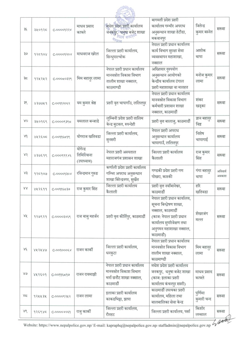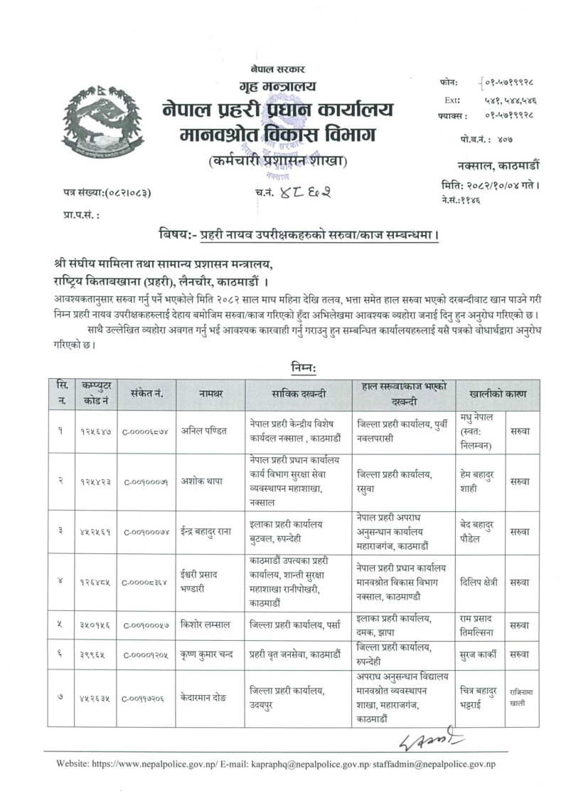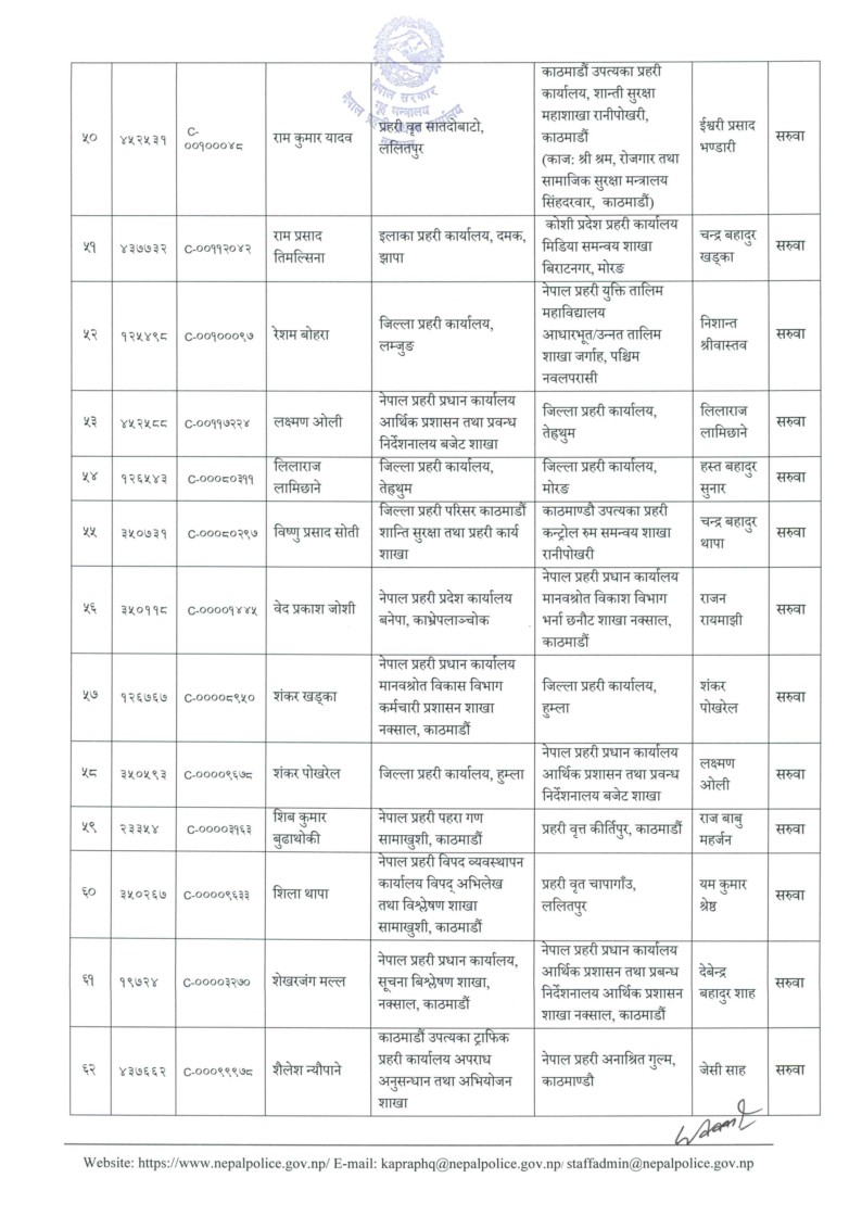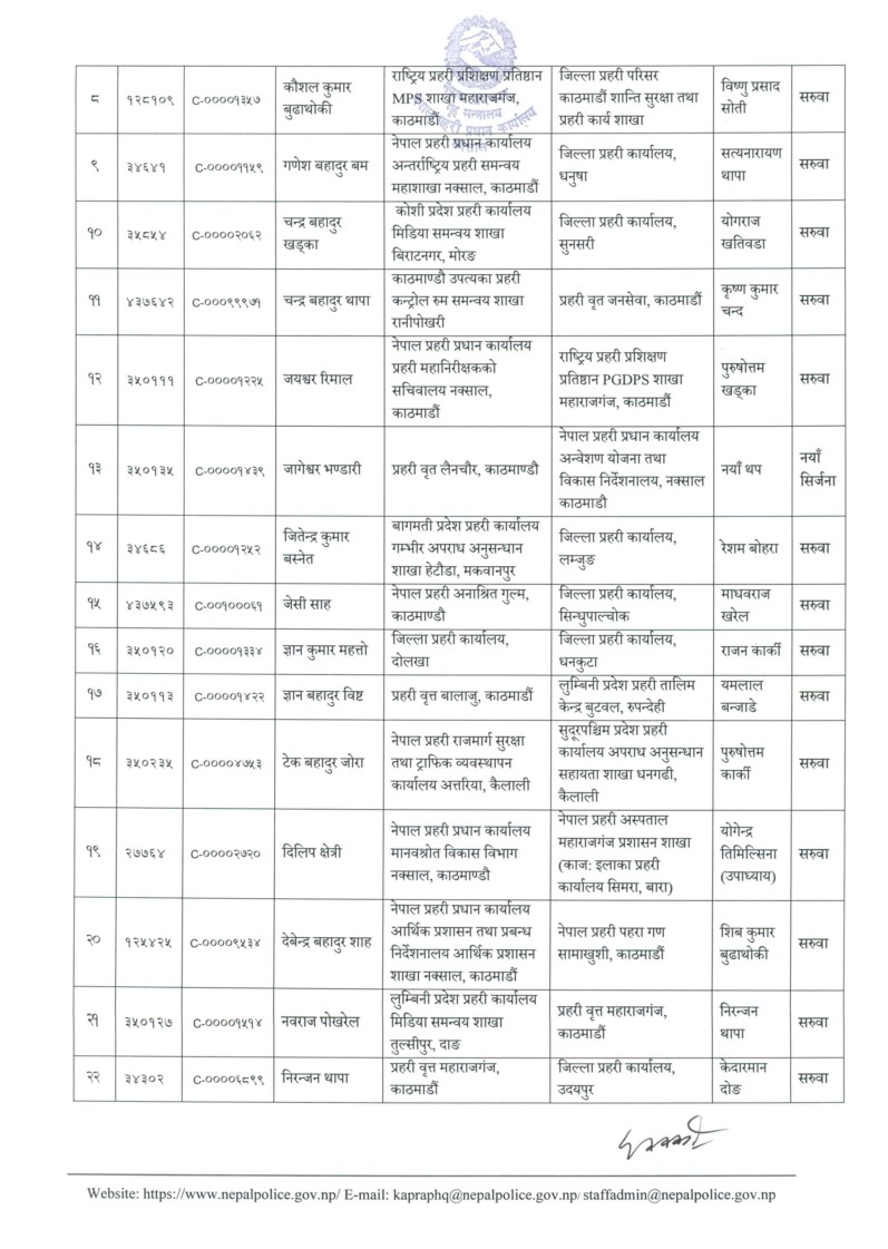 आइतबार प्रहरी प्रधान कार्यालयले आवश्यकताअनुसार यो सरुवा गरेको जनाएको छ। यो सरुवा सूची अनुसार केन्द्रीय अनुसन्धान ब्युरो, अपराध अनुसन्धान महाशाखा र विभिन्न जिल्ला प्रहरी कार्यालयमा परिवर्तन भएको छ।