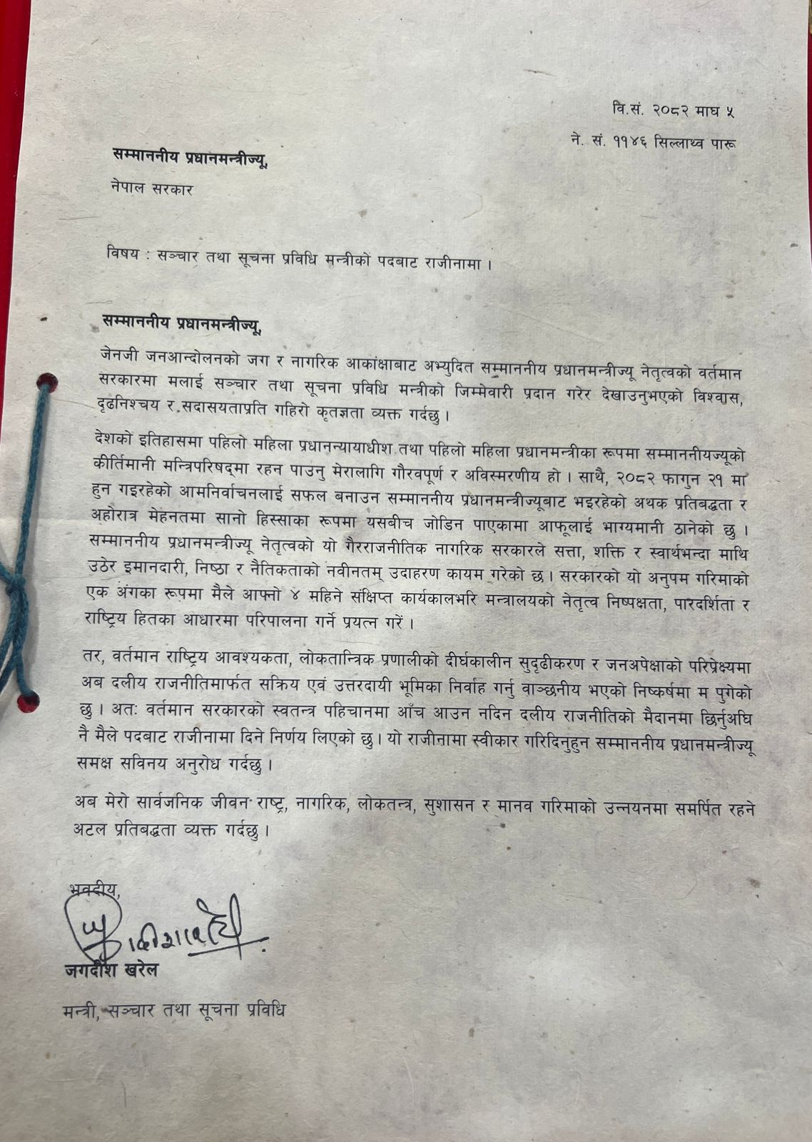 काठमाडौं । सञ्चार, सूचना तथा प्रविधिमन्त्री जगदीश खरेलले पदबाट राजीनामा दिएका छन् । आसन्न फागुन २१ गते हुने निर्वाचनमा सहभागी हुनको लागि मन्त्री खरेलले राजिनामा दिएका हुुन् ।