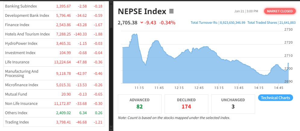 नेपाल स्टक एक्सचेञ्ज (नेप्से) ९.४३ अकंले घटेर २७०५.३८ बिन्दुमा कायम भएको छ । आज ३२४ कम्पनीको २ करोड १६ लाख ४१ हजार कित्ता शेयर किनबेच हुँदा ८ अर्ब ९२ करोड ३६ लाख रुपैयाँको कारोबार भएको हो ।
