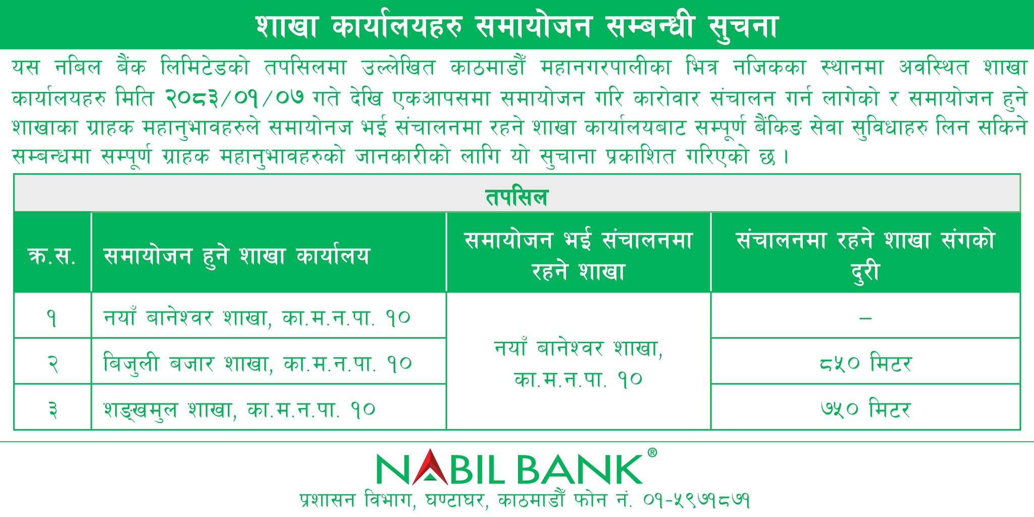 बैंकको नयाँ बानेश्वर शाखा, बिजुली बजार र शङ्खमुल शाखा मर्ज भई समायोजन गरी नयाँ बानेश्वर शाखा कार्यालयले जनाएको छ।