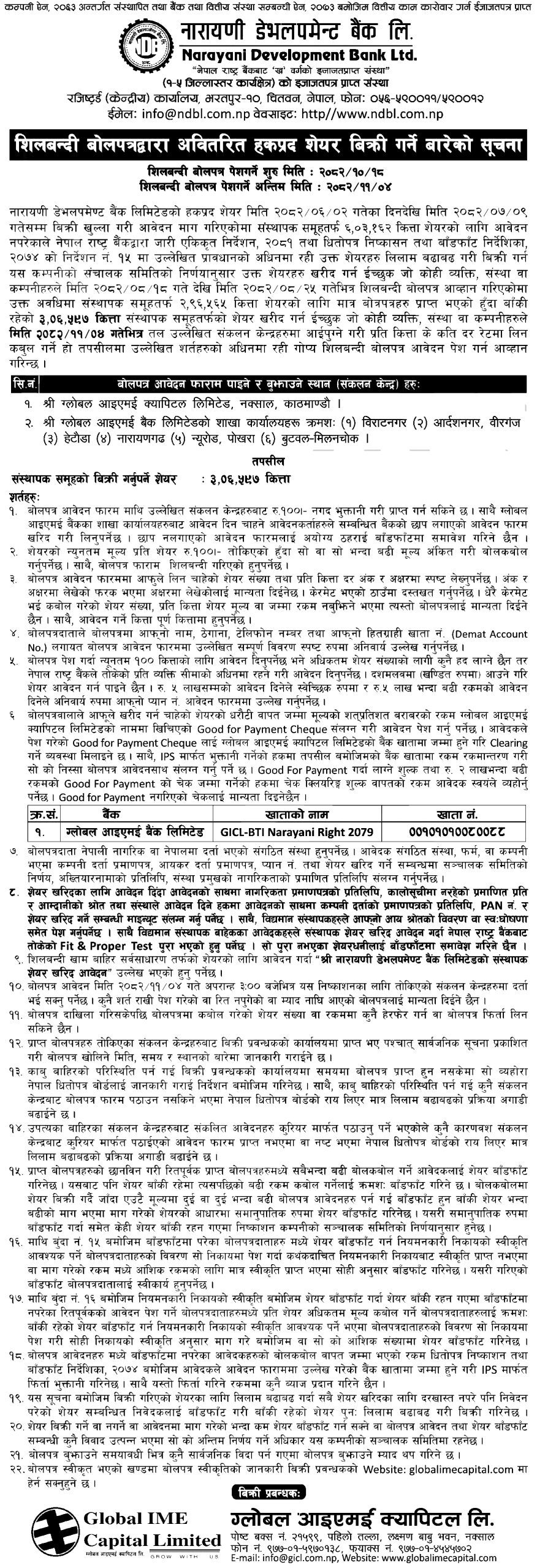 काठमाडौं । नारायणी डेभलपमेन्ट बैंक लिमिटेडले असोज २ गतेदेखि कात्तिक ९ गतेसम्म हकप्रद शेयर निष्कासन गरी बाँडफाँड गर्दा अवितरित रहेको शेयर पुनः लिलाम बिक्रीमा राखेको छ।