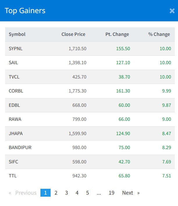 शेयर बजारमा आज विभिन्न सेक्टरका १६२ वटा कम्पनीहरुको शेयरमूल्यमा हरियाली छाएको छ । जसमा एसवाई प्यानल, श्रीनगर एग्रोटेक, त्रिशुली जलविद्युत कम्पनी र कर्पोरेट डेभलपमेन्ट बैंकको शेयरमूल्यमा सकारात्मक सर्किट लागेको छ ।