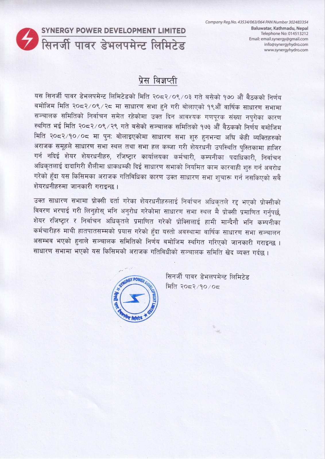 सिनर्जी पावरले भन्यो, ‘अराजक समूहको दादागिरी र धाकधम्कीका कारण साधारण सभा स्थगित’