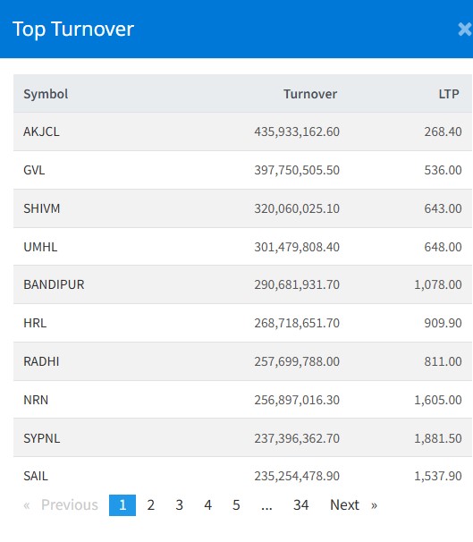 त्यस्तै, ग्रीन भेन्चर्सको ३९ करोड ७७ लाख रुपैयाँ, शिवम् सिमेन्टको ३२ करोड रुपैयाँ, युनाइटेड मोदी हाइड्रोपावरको ३० करोड १४ लाख रुपैयाँ र बन्दीपुर केवलकारको २९ करोड ६ लाख रुपैयाँले सर्वाधिक कारोबार भएको छ ।