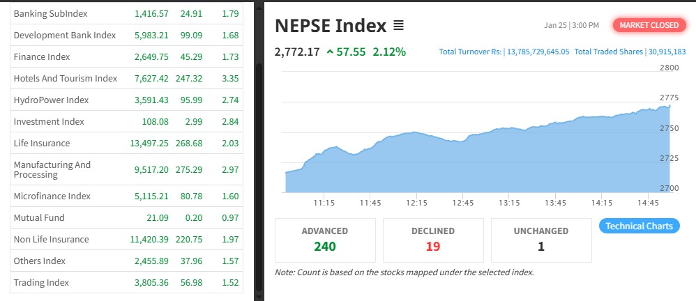 यसअघि १३ उपसूचकमा नै हरियाली आएको छ । आज वाणिज्य बैंक समूहको १.७९ प्रतिशत, विकास बैंक समूहको १.६८ प्रतिशत, फाइनान्स समूहको १.७३ प्रतिशत, होटल तथा पर्यटन समूहको ३.३५ प्रतिशतले शेयर मूल्य बढेको हो ।