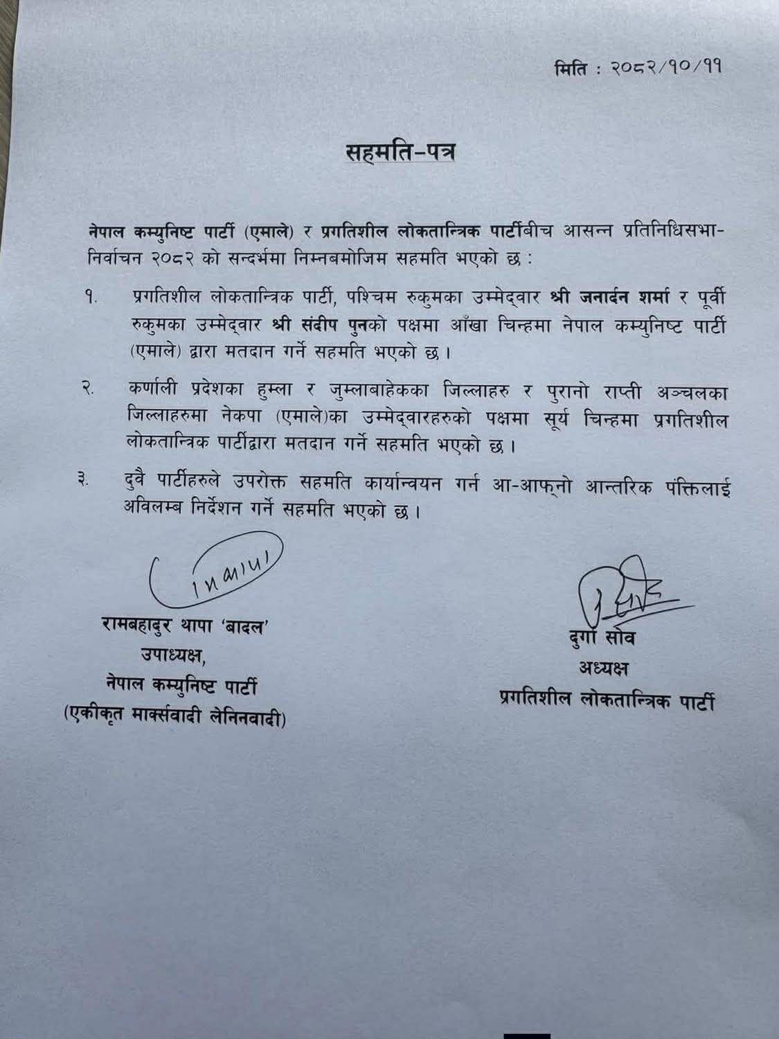 काठमाडौं । नेकपा एमाले र प्रगतिशील लोकतान्त्रिक पार्टी (प्रलोपा) बीच चुनावी तालमेलसम्बन्धी तीन बुँदे सहमति भएको छ।