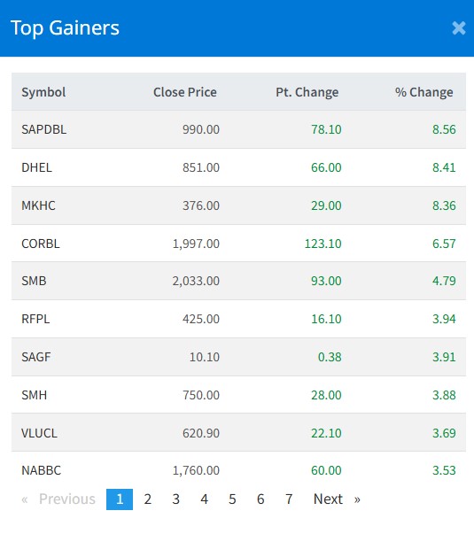 शेयर बजारमा आज विभिन्न सेक्टरका ३४ वटा कम्पनीहरुको शेयरमूल्यमा हरियाली छाएको छ । मंगलबार सप्तकोशी डेभलपमेन्ट बैंकको ८.५६ प्रतिशत, दरमखोला हाइड्रोपावरको ८.४१ प्रतिशत, मायाखोला हाइड्रोपावरको ८.३६ प्रतिशतले शेयरमूल्य बृद्धि भएको छ ।