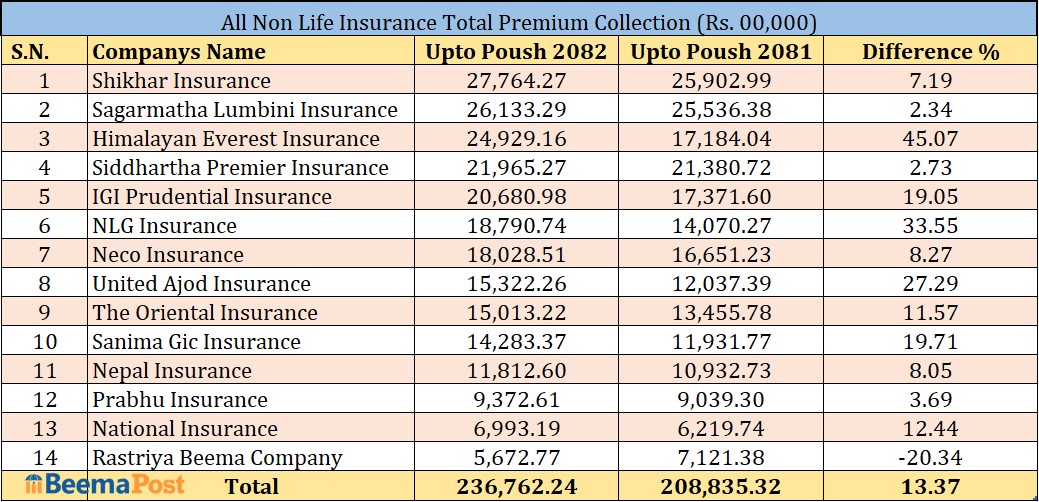सर्वाधिक ब्यवसाय वृद्धि गर्नेमा हिमालयन एभरेष्ट र एनएलजी इन्स्योरेन्स पहिलो नम्बरमा रहेको हुन् ।