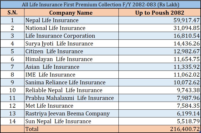 विवरण अनुसार पुष मसान्तसम्ममा नेपाल लाइफ र नेशनल लाइफ इन्स्योरेन्सले सबैभन्दा बढी प्रथम बीमा शुल्क आर्जन गर्न सफल भएका छन् । नेपाल लाइफले ५ अर्ब ९९ करोड र नेशनल लाइफले ३ अर्ब १० करोड नयाँ ब्यवसाय आर्जन गरेका हुन् ।