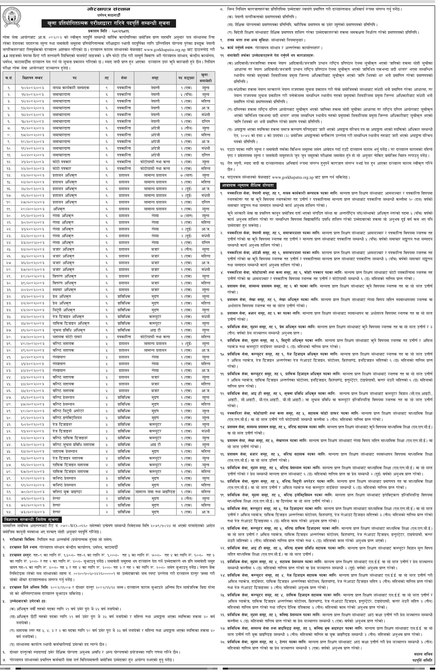 काठमाडौं । गोरखापत्र संस्थानले विभिन्न पदहरूका लागि ८६ जनाबाट दरखास्त आह्वान गरेको छ। संस्थानले खुला तथा समावेशी समूहमा प्रतियोगितात्मक परीक्षद्वारा स्थायी पदपूर्तिका लागि नेपाली नागरिकहरूबाट दरखास्त आह्वान गरेको हो।