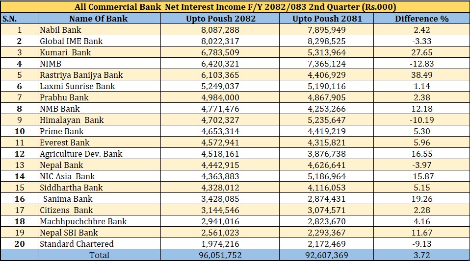 पुष मसान्तसम्मको अवधिमा एभरेष्ट बैंकको खुद ब्याज आम्दानी ४ अर्ब ५७ करोड, कृषि विकास बैंकको ४ अर्ब ५१ करोड, नेपाल बैंकको ४ अर्ब ४४ करोड, एनआईसी एशिया बैंकको ४ अर्ब ३६ करोड, सिद्धार्थ बैंकको ४ अर्ब ३२ करोड, सानिमा बैंकको ३ अर्ब ४२ करोड, सिटिजन बैंकको ३ अर्ब १४ करोड, माछापुच्छ्रे बैंकको २ अर्ब ९४ करोड, नेपाल एसबिआई बैंकको २ अर्ब ५६ करोड र स्ट्याण्डर्ड चार्टर्ड बैंकको १ अर्ब ९७ करोड रुपैयाँ रहेको हो ।