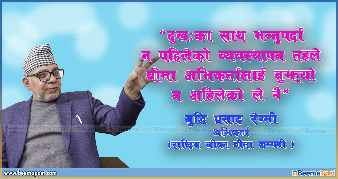८० प्रतिशतभन्दा बढी बीमा सरकारमार्फत अनिवार्य हुने हुँदा राष्ट्रिय जीवन बीमा कम्पनीका अभिकर्ताहरु छाँयामा परेको गुनासो आईरहदा बीमापोष्टले दुई दशक कम्पनीमा बिताएका रेग्मीसँग कम्पनीसँग अभिकर्ताहरुको अवस्थाको बारेमा बुझने प्रयासमा गरिएको प्रश्नः