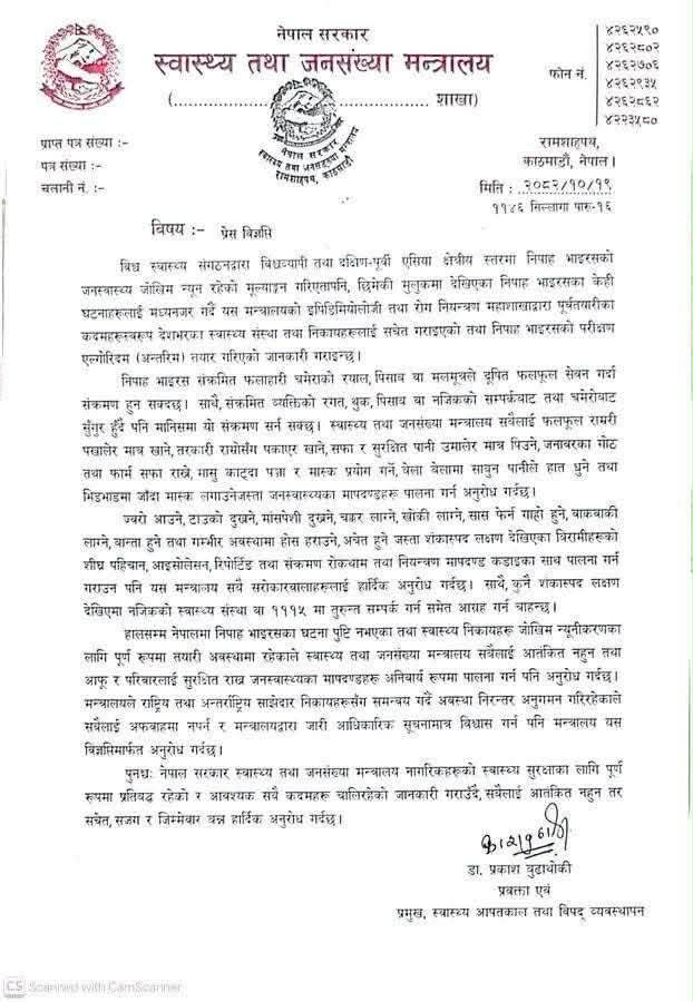 हालसम्म नेपालमा निपाह भाइरसको घटना पुष्टि नभएको र स्वास्थ्य निकायहरू पूर्ण तयारी अवस्थामा रहेको मन्त्रालयले जनाएको छ। मन्त्रालयले राष्ट्रिय तथा अन्तर्राष्ट्रिय साझेदार निकायसँग समन्वय गर्दै अवस्था अनुगमन गरिरहेको छ र अफवाहमा नपर्न तथा आधिकारिक सूचनामात्र विश्वास गर्न नागरिकहरूलाई अनुरोध गरेको छ।