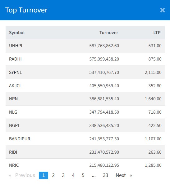 त्यस्तै, राधि विद्युत कम्पनीको ५७ करोड ५० लाख ९९ हजार रुपैयाँ, एसवाई प्यानलको ५३ करोड ७४ लाख रुपैयाँ, आँखुखोला जलविद्युतको ४० करोड ५५ लाख रुपैयाँले सर्वाधिक कारोबार भएको छ ।