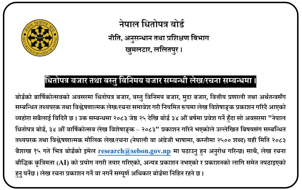 नेपाल धितोपत्र बोर्डले प्रत्येक वर्ष आफ्नो वार्षिकोत्सवका अवसरमा धितोपत्र बजार, वस्तु विनिमय बजार, मुद्रा बजार, वित्तीय प्रणाली तथा समग्र अर्थतन्त्रसँग सम्बन्धित तथ्यपरक तथा विश्लेषणात्मक लेख–रचना समावेश गरी लेख विशेषाङ्क नियमित रूपमा प्रकाशन गर्दै आएको छ। सोही परम्पराअनुसार यस वर्ष पनि उल्लेखित विषयसँग सम्बन्धित मौलिक लेख–रचना आम सरोकारवालाबाट माग गरिएको बोर्डले जनाएको छ।