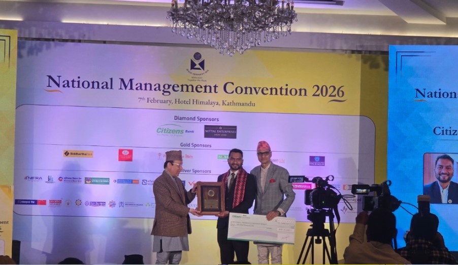 काठमाडौं । सिटिजन्स बैंक इन्टरनेसनल लिमिटेडले म्यान सिटिजन एसपाइरिङ मेनेजर अवार्ड–२०८२ गौरव उप्रेतीलाई प्रदान गरेको छ । उक्त अवार्ड नेपाल व्यवस्थापन संघ (एमएएन) द्वारा आयोजना गरिएको राष्ट्रिय व्यवस्थापन सम्मेलनमा माघ २४ गते प्रदान गरिएको हो ।