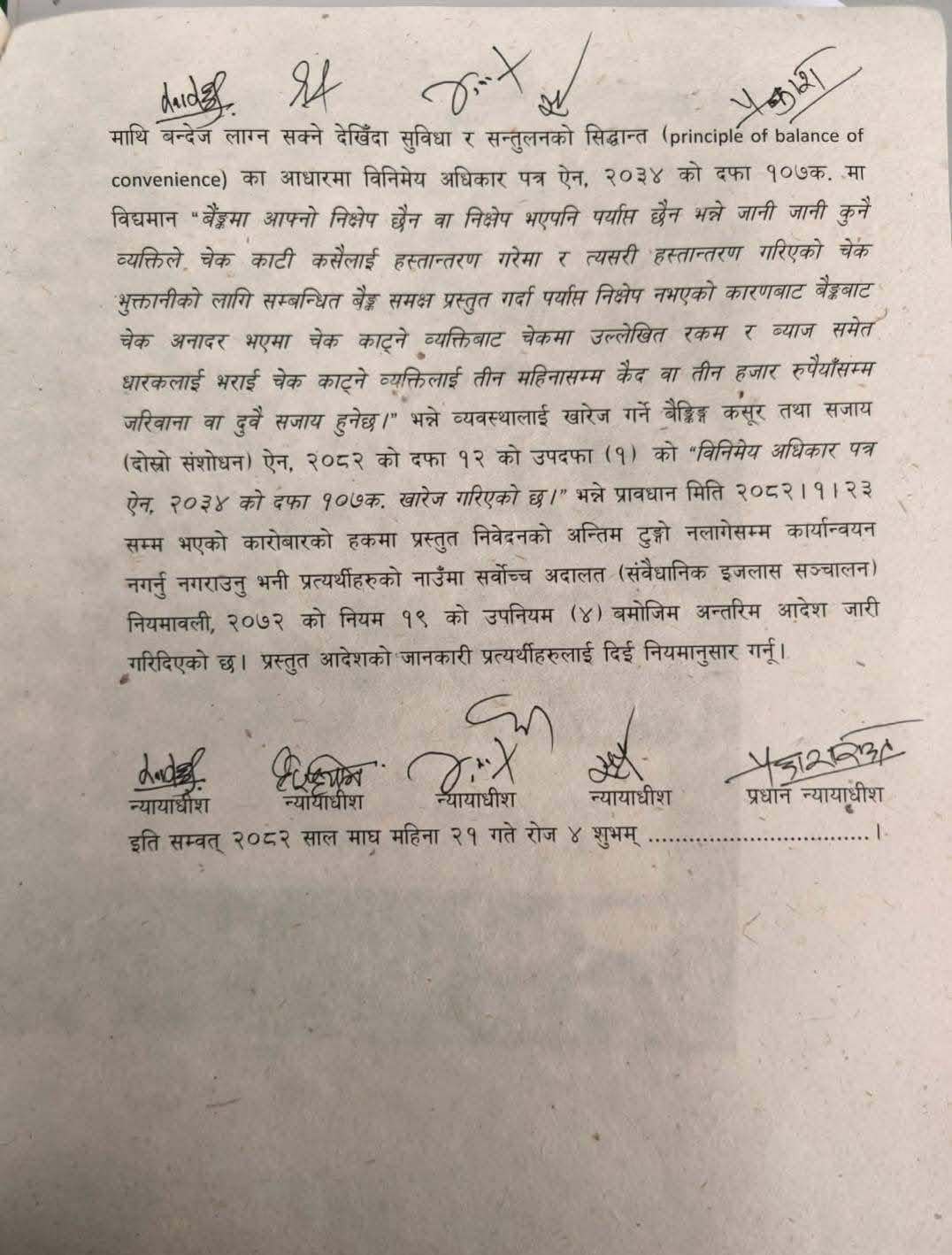 काठमाडौं । सर्वोच्च अदालतले बैंकिङ्ग कारोबारमा चेक अनादर (बाउन्स) सम्बन्धी सजाय कम गर्ने उद्देश्यले गरिएको कानूनी संशोधन तत्काल लागू नगर्न अन्तरिम आदेश जारी गरेको छ। संवैधानिक इजलासले अन्तिम फैसला नभएसम्म पुरानै व्यवस्था कायम राख्न आदेश दिएको हो।