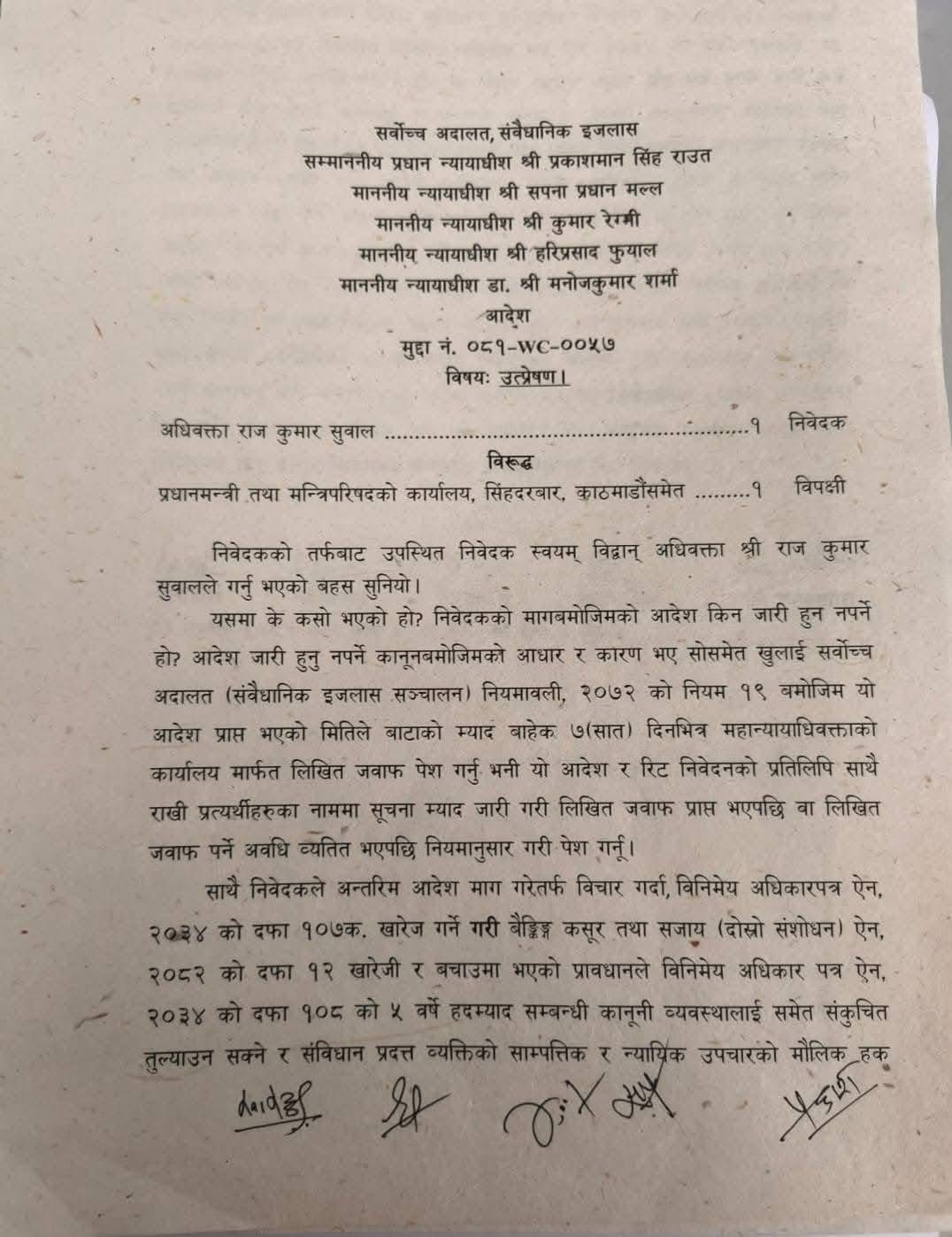 सर्वाेच्च अदालतका प्रधान न्यायाधीश प्रकाशमानसिंह राउत सहित न्यायाधीशहरू सपना प्रधान मल्ल, कुमार रेग्मी, हरिकृष्ण फुयाल र डा. मनोजकुमार शर्माको संवैधानिक इजलासले अधिवक्ताद्वय राजकुमार सुवाल र सागर अधिकारीले दायर गरेको रिटमाथि सुनुवाई गर्दै यस्तो अन्तरिम आदेश जारी गरेको हो।