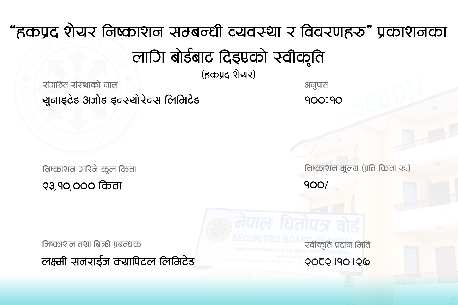 युनाइटेड अजोड इन्स्योरेन्सले पायो बोर्डबाट हकप्रद निष्कासनको अनुमति