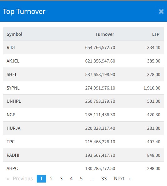 त्यस्तै, आँखुखोला जलविद्युतको ६२ करोड १३ लाख रुपैयाँ, सिंगटी हाइड्रो इनर्जीको ५८ करोड ७६ लाख रुपैयाँ, एसवाई प्यानलको २७ करोड ४९ लाख रुपैयाँले सर्वाधिक कारोबार भएको छ ।