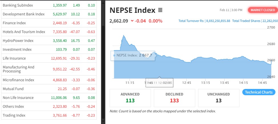 नेपाल स्टक एक्सचेञ्ज (नेप्से) ०.०४ प्रतिशतले घटेर २६६२.०९ बिन्दुमा कायम भएको छ । आज ३२९ कम्पनीको २ करोड २२ लाख ८२ हजार कित्ता शेयर किनबेच हुँदा ८ अर्ब ६९ करोड २२ लाख रुपैयाँको कारोबार भएको हो ।