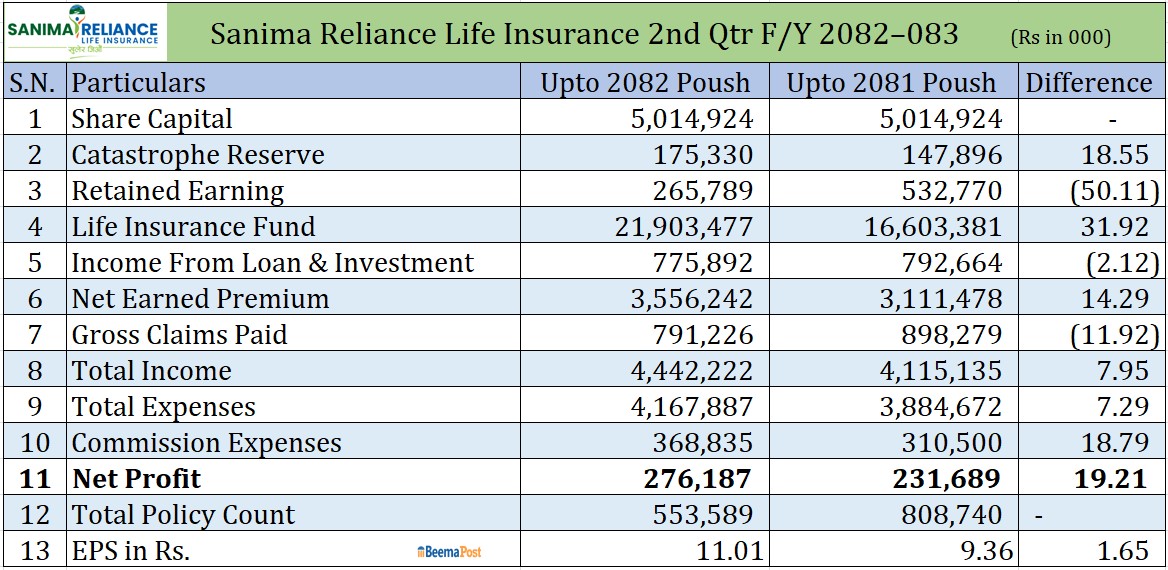 समीक्षा अवधीमा सानिमा रिलायन्स लाइफको कूल खर्च ७.२९ प्रतिशत बढेर चार अर्ब १६ करोड रुपैयाँ रहेको छ भने कुल आम्दानी ७.९५ प्रतिशतले बढेर चार अर्ब ४४ करोड रुपैयाँ रहेको छ । समीक्षा अवधिमा कम्पनीको ईपीएस ११.१ रुपैयाँ रहेको छ ।