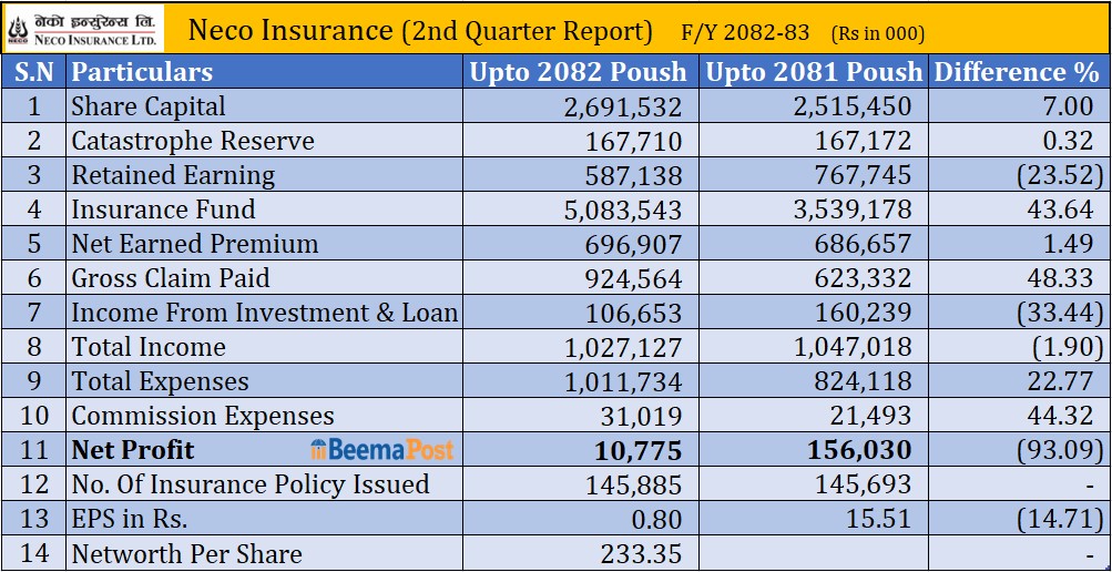 गत आर्थिक वर्षको सोहि अवधिमा भने कम्पनीले १५ करोड ६० लाख ३० हजार रुपैयाँ नाफा कमाएको थियो । भदौमा भएको जेन जी आन्दोलन र असोजमा भएको बाढी पहिरोका कारण ठूलो राशीको बीमा दाबीका बीच कम्पनीको नाफालाई सन्तोषजनक रुपमा हेरिएको छ ।