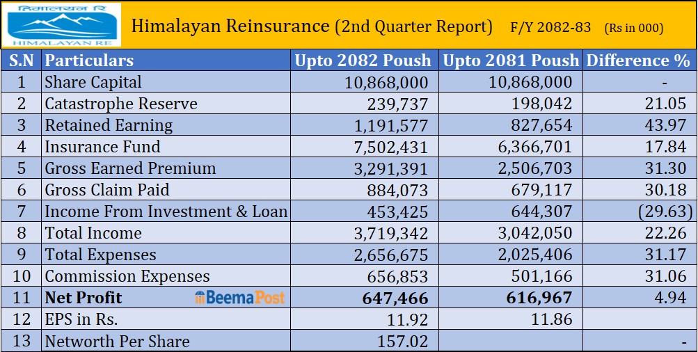 हिमालयन रि इन्स्योरेन्सको खुद नाफा ६४ करोड ७४ लाख, ईपीएससहित अन्य सूचक कस्ता ?