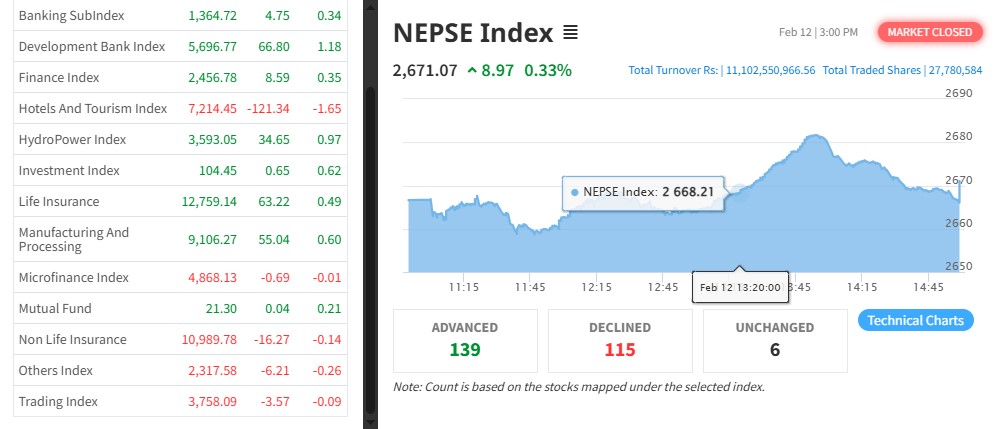 नेपाल स्टक एक्सचेञ्ज (नेप्से) ८.९७ अकंले बढेर २६७१.०७ बिन्दुमा कायम भएको छ । आज ३३७ कम्पनीको २ करोड ७७ लाख ८० हजार कित्ता शेयर किनबेच हुँदा ११ अर्ब १० करोड २५ लाख रुपैयाँको कारोबार भएको हो ।