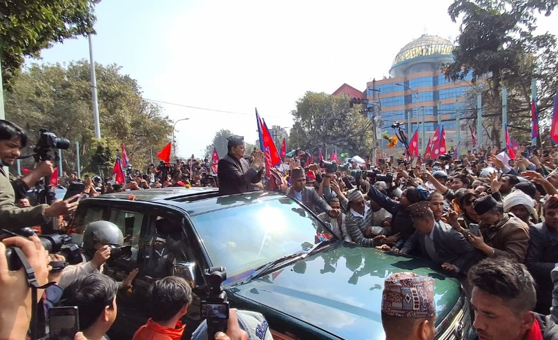 उनलाई स्वागत गर्न राष्ट्रिय प्रजातन्त्र पार्टी (राप्रपा) का नेता कमल थापा र दुर्गा प्रसाईंसहितका समर्थकहरू विमानस्थलमा उपस्थित थिए।