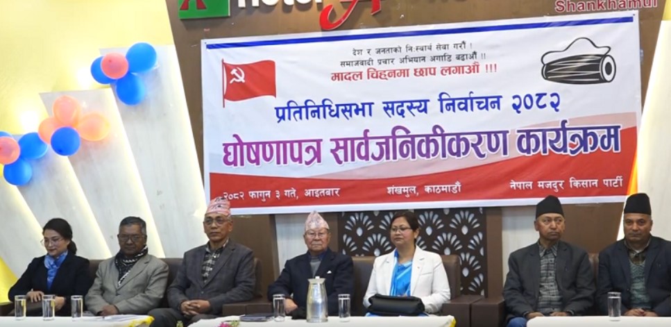 काठमाडौँ । नेपाल मजदुर किसान पार्टीले आगामी प्रतिनिधिसभा निर्वाचनका लागि आफ्नो घोषणापत्र सार्वजनिक गरेको छ । आइतबार काठमाडौँमा आयोजित कार्यक्रममा पार्टीका अध्यक्ष नारायणमान बिजुक्छे ले घोषणापत्र सार्वजनिक गर्दै पार्टीले संसदलाई देशभक्तहरूको जीवन्त सदनका रूपमा विकास गर्न निरन्तर आवाज उठाउँदै आएको बताए ।