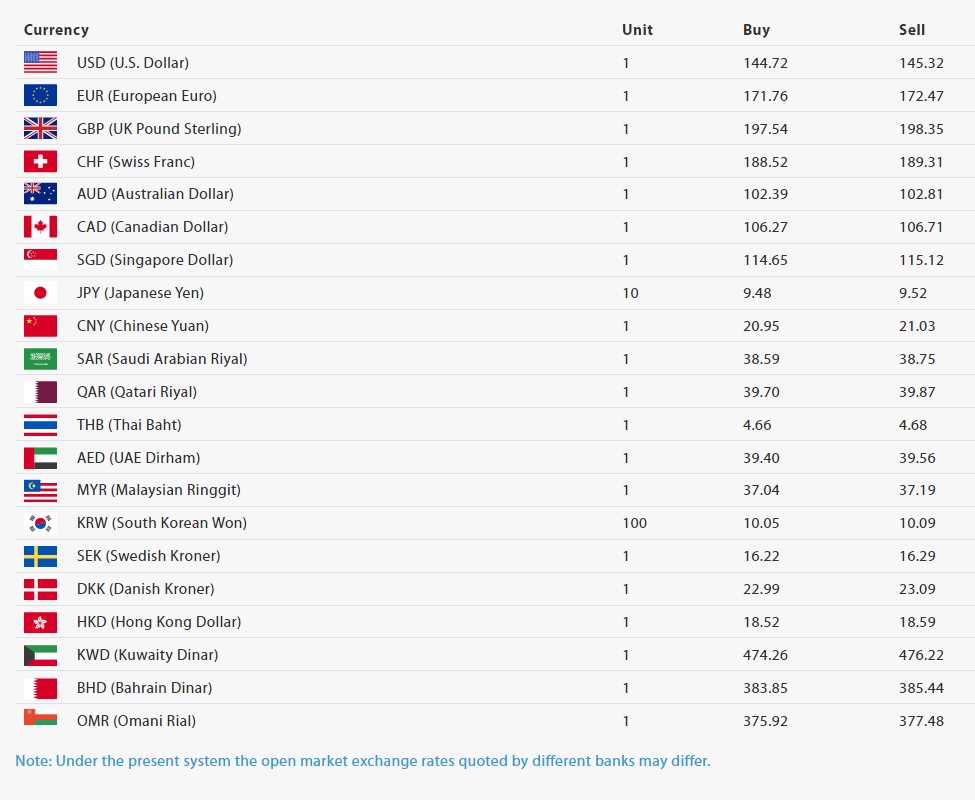 त्यसैगरी एक यूएई दिरामको खरीदमूल्य ३९.४० रुपैयाँ र बिक्रीमूल्य ३९.५६ रुपैयाँ, एक मलेसियन रिंगिटको खरीदमूल्य ३७.०४ रुपैयाँ र बिक्रीमूल्य ३७.१९ रुपैयाँ र १०० दक्षिण कोरियन वोनको खरीदमूल्य १०.०५ रुपैयाँ र बिक्रीमूल्य १०.०९ रुपैयाँ तोकिएको छ।