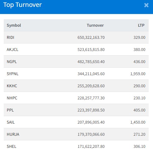 त्यस्तै, आँखु खोला, नाग्दी गुप्र, एसवाई प्यानल, खानी खोला हाईड्रोपावर, नेशनल हाईड्रोपावर, पिपुल्स पावर, श्रीनगर एग्ररीटेक, हिमालयन उर्जा र सिंगटी हाईड्रो इनर्जीको सर्वाधिक कारोबार भएको छ ।