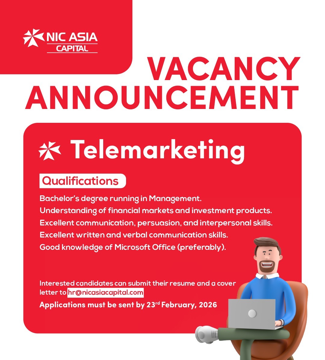 काठमाडौँ । एनआईसी एशिया क्यापिटलले टेलिमार्केटिङ पदका लागि कर्मचारी माग गरेको छ।