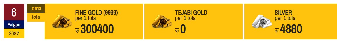 नेपाल सुनचाँदी व्यवसायी महासंघका अनुसार यस दिन सुन प्रतितोला ३ लाख ४०० रुपैयाँमा कारोबार भइरहेको छ । मंगलबारको बजारमा सुन प्रतितोला ३ लाख एक हजार ९०० रुपैयाँमा कारोबार भएको थियो ।