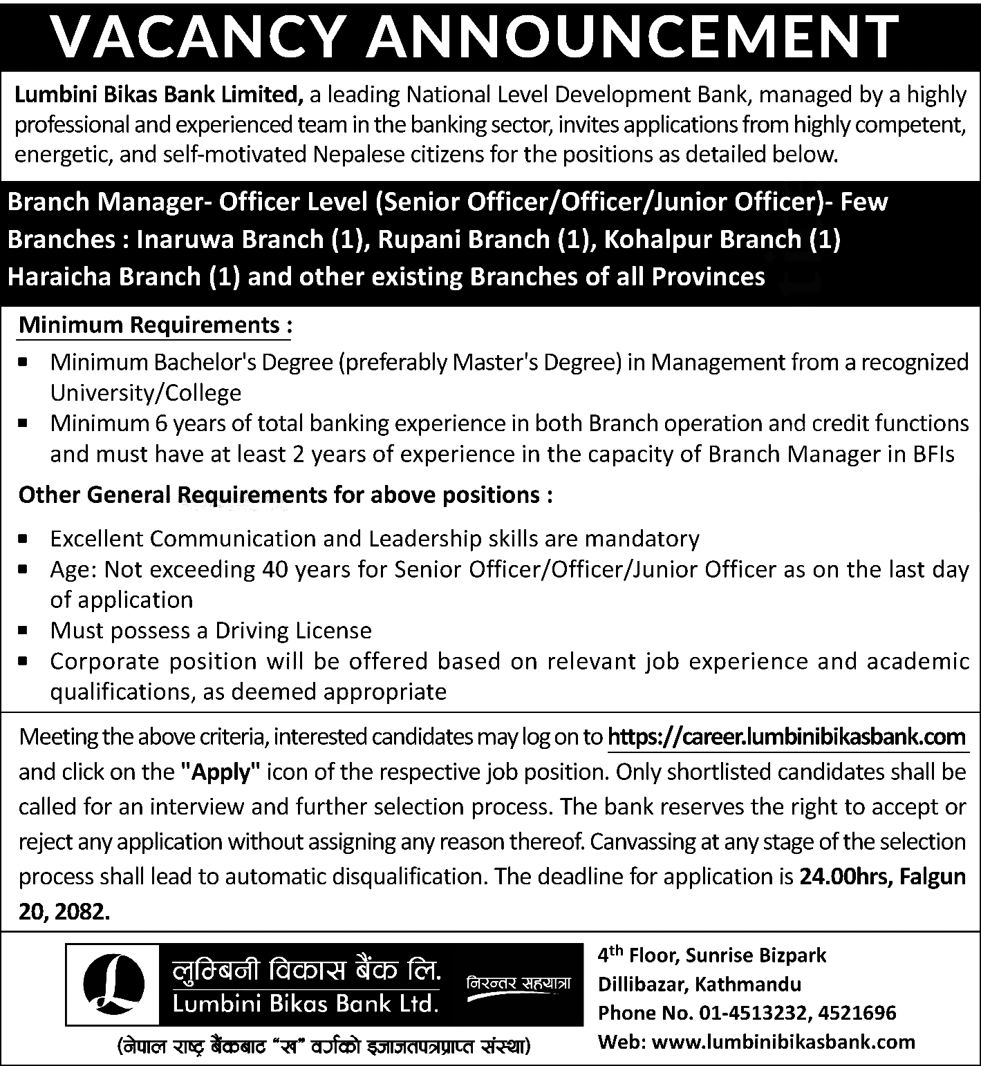 बैंकले इनरुवा, रुपनी, कोहलपुर र हरैंचा शाखामा एक–एक जना र अन्य प्रदेशका शाखाहरूमा पनि आवश्यकता अनुसार पदपूर्ति गरिने जनाएको छ। यसका लागि मान्यताप्राप्त शैक्षिक संस्थाबाट व्यवस्थापन विषयमा स्नातक उत्तीर्ण गरेको हुनुपर्नेछ भने स्नातकोत्तर उत्तीर्णलाई प्राथमिकता दिइनेछ।
